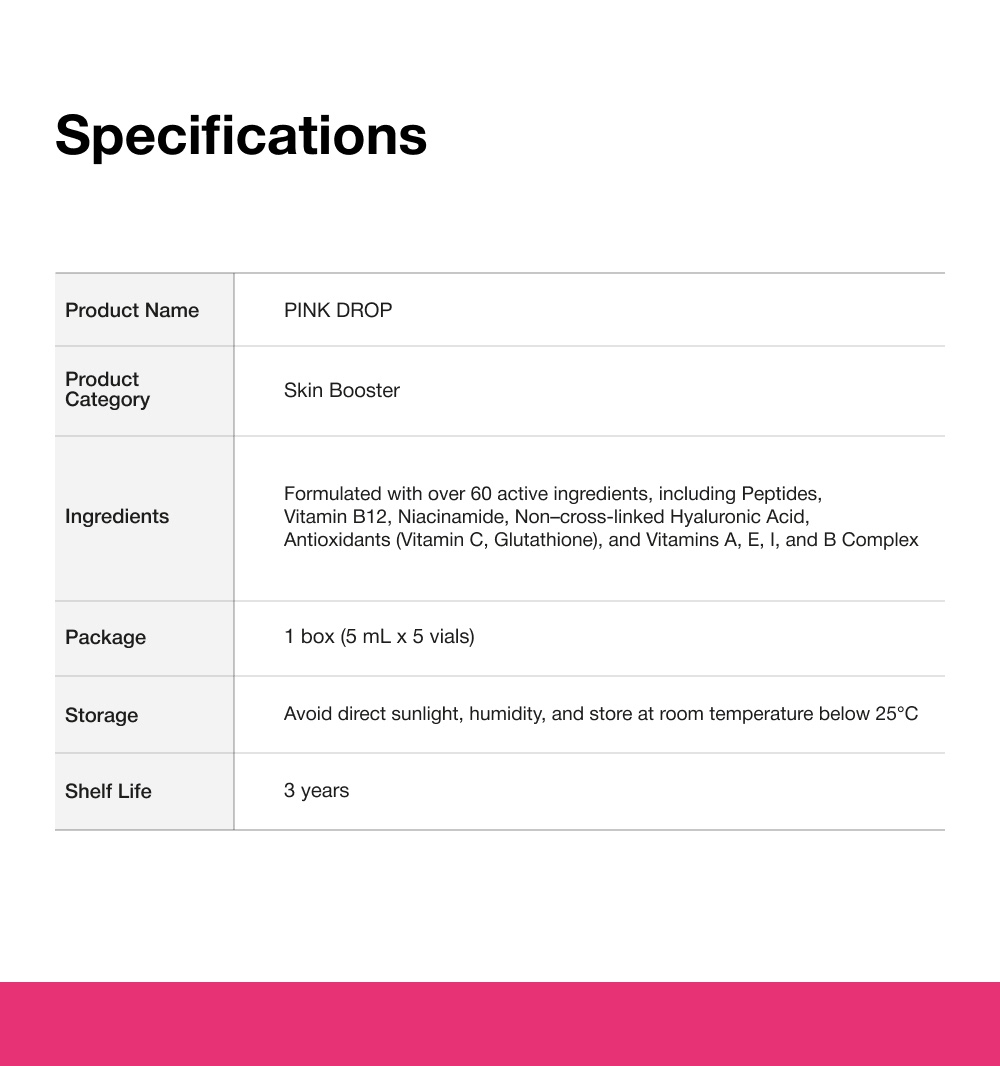 Pink Drop is an all-in-one skin booster that revitalizesdull, tired skin by deeply hydrating, brightening, andrestoring its natural glow for a healthier, more radiantcomplexion.