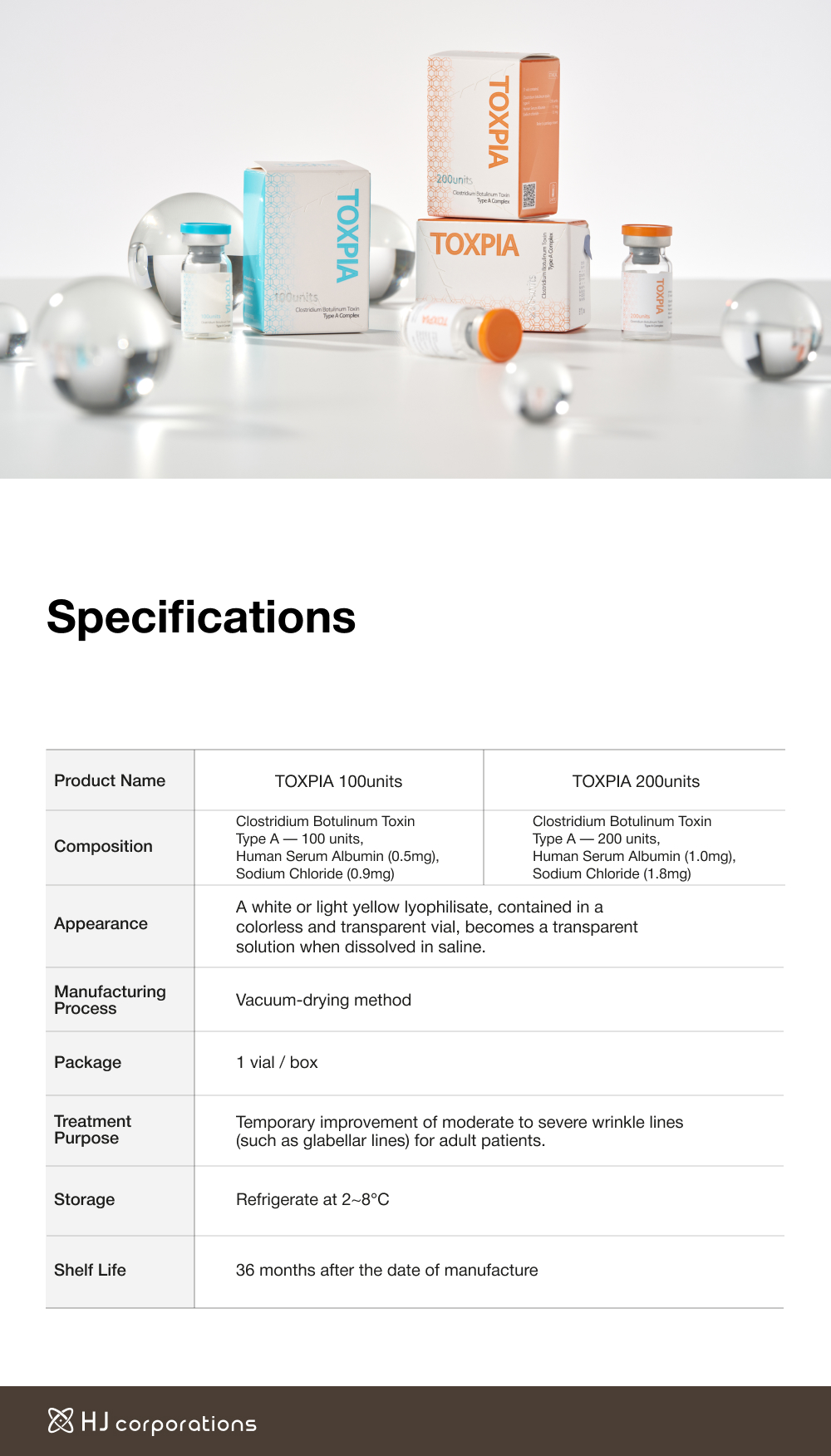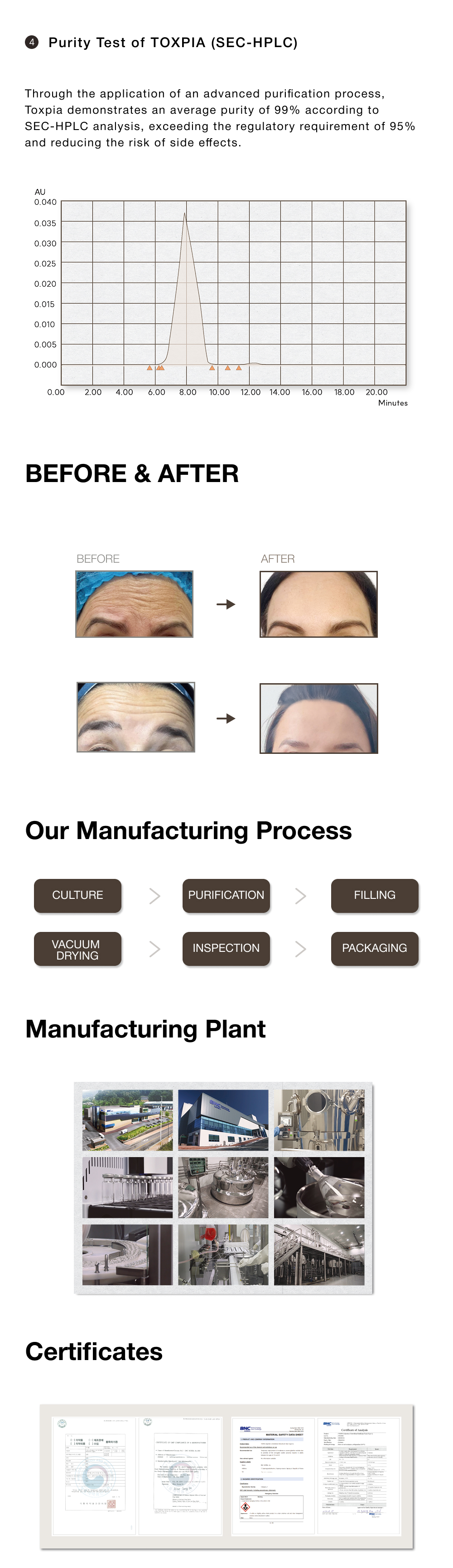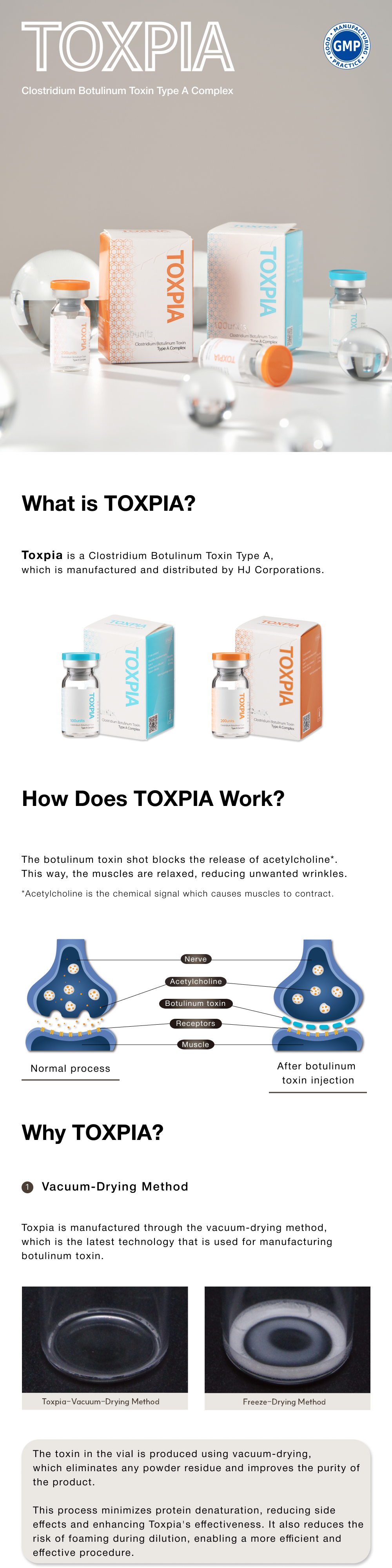 TOXPIA is a Botulinum Toxin Type A product developed in Korea that temporarily reduces glabella wrinkles, perfect for adults looking for safe and effective aesthetic wrinkle care.